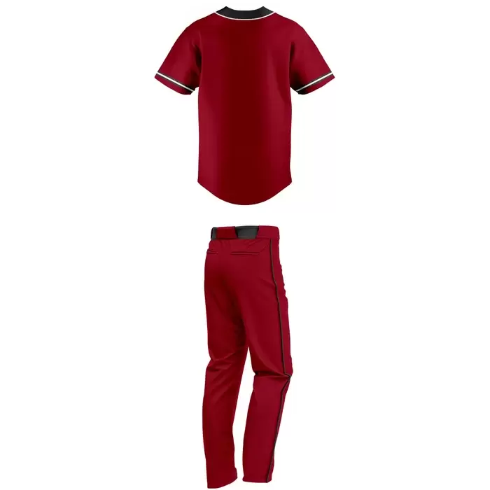 Discover premium baseball uniforms from Colaro Sports, the leading manufacturer of high-performance baseball uniforms designed for champions. Colaro Sports custom cut & sew baseball uniform: fiery red jersey with black placket/collar trim, crisp white sleeve piping, chest crest, paired with red long pants featuring bold black side stripes and black belt.