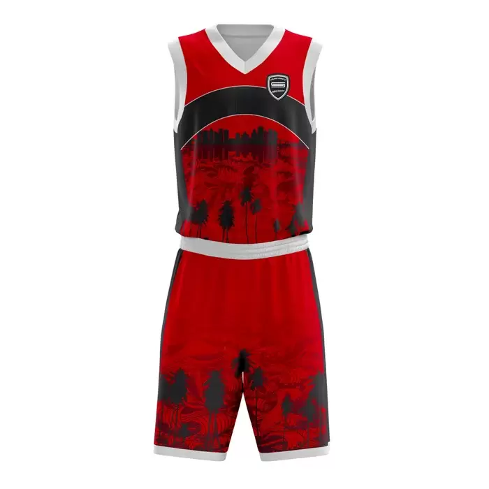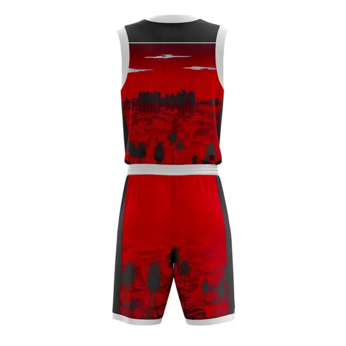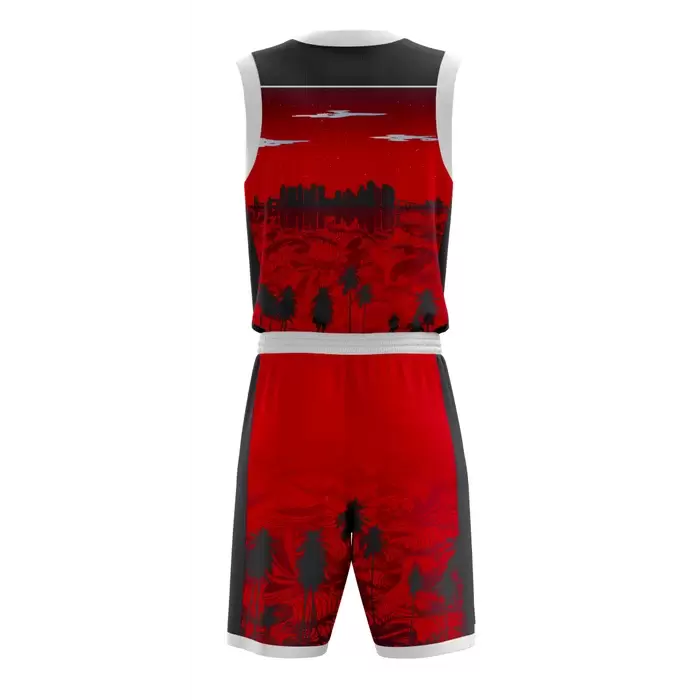 Colaro Sports, a premium basketball uniform manufacturer, presents its signature black and red uniform. Colaro Sports red, black, and white sublimated basketball uniform featuring haunting tree and cityscape silhouettes across a blood-red base. A thick black horizontal chest stripe adds instant authority, while white piping delivers crisp contrast. This is streetball artistry meets pro-level performance. Ideal for city leagues, streetball tournaments, or any team that wants to own the night.