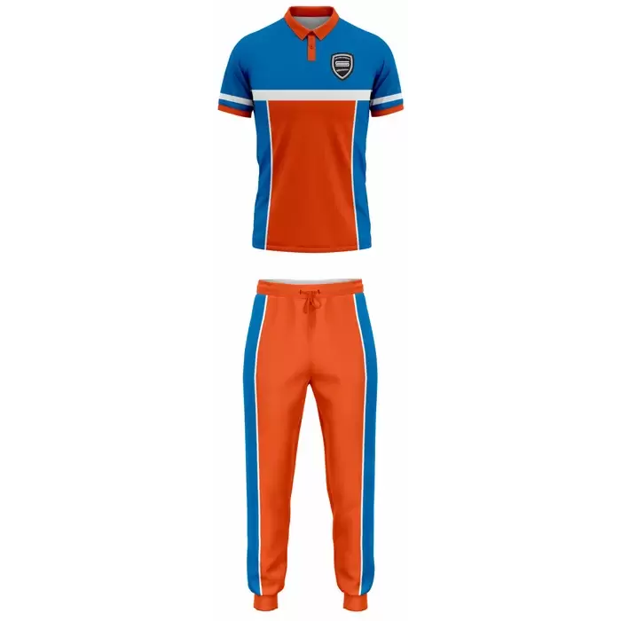 Discover premium bowling uniforms from Colaro Sports, the leading manufacturer of high-performance bowling kits designed for champions. Colaro Sports Blue & Orange Cut & Sew Bowling Uniform two-piece bowling set featuring a dynamic blue orange polo shirt with white chest stripe and matching long track pants with bold side panels. Our custom cut & sew bowling jerseys by Colaro Sports, perfect blend of style and performance.