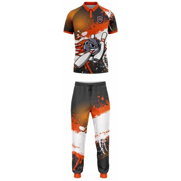 Discover premium bowling uniforms from Colaro Sports, the leading manufacturer of high-performance bowling kits designed for champions. Colaro Sports Flaming Bowling Ball Sublimation Uniform black orange splatter two-piece set featuring a flaming bowling ball graphic crushing pins. Fully customizable, vibrant, permanent sublimation bowling jerseys and pants.