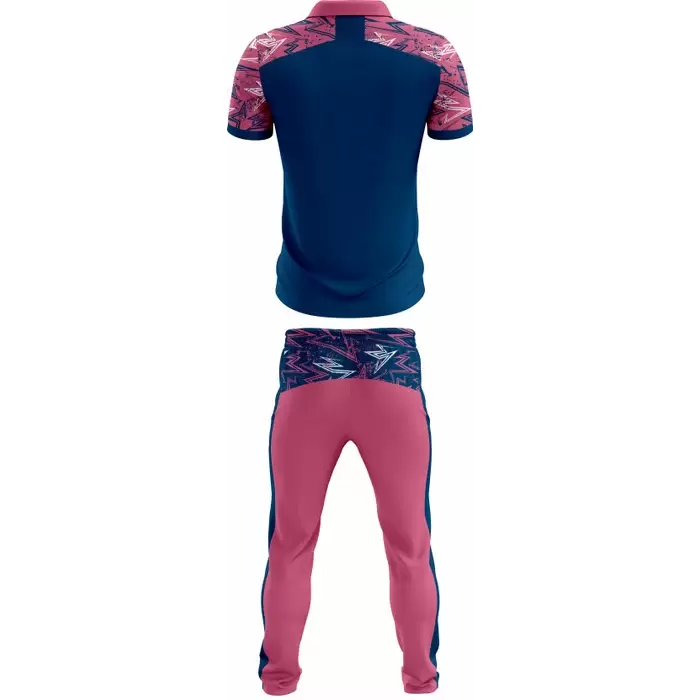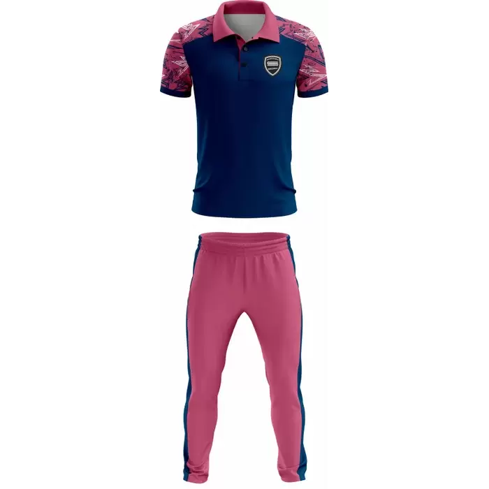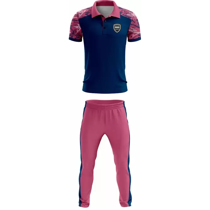 Colaro Sports, a premium cricket uniform manufacturer, presents its signature navy blue and pink cricket uniform. Colaro Sports cricket uniform engineered two-piece kit features a dominant navy blue short-sleeved polo shirt electrified by a vibrant pink collar and explosive pink patterned shoulders and sleeves that demand attention. The design flips boldly on the full-length athletic pants: a pink base with powerful navy blue side stripes running down each leg, creating one of the most daring and coordinated looks in cricket today.