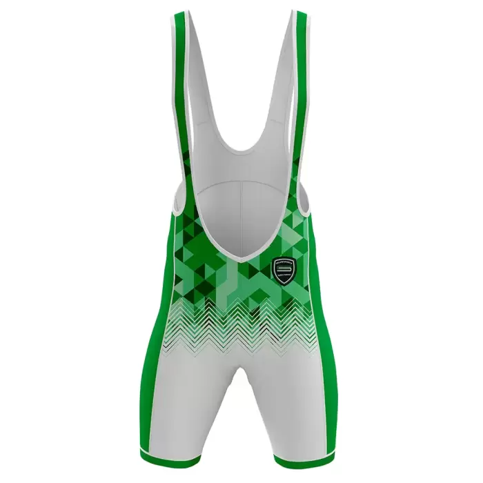 Discover premium cycling uniforms from Colaro Sports, the leading manufacturer of high-performance cycling singlets designed for champions. Colaro Sports white and green sublimation cycling bib uniform. Stunning geometric green polygon chest patterns transition into sharp chevrons, framed by solid green side panels for premium comfort and perfect fit.
