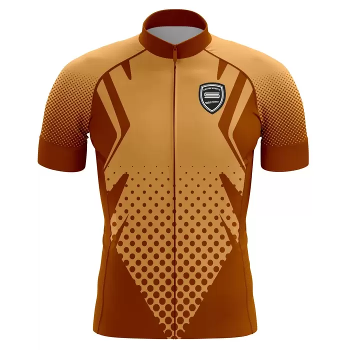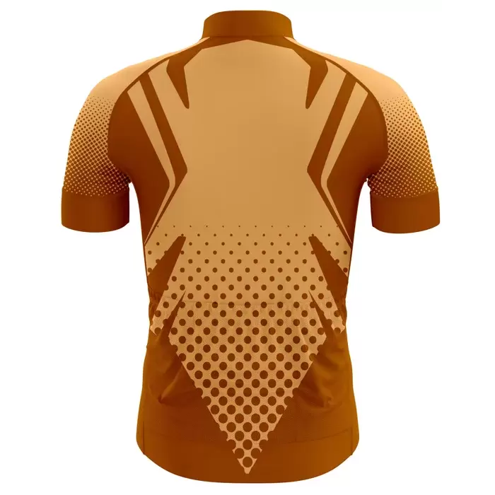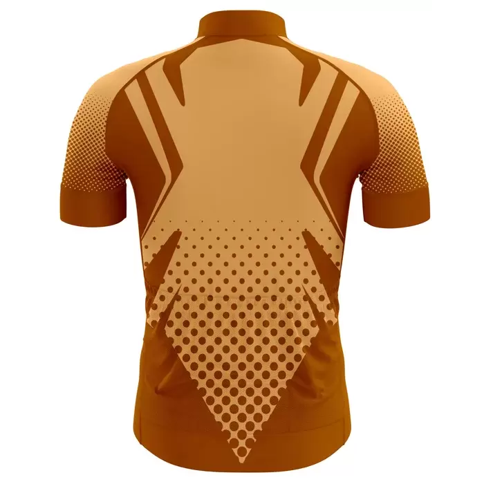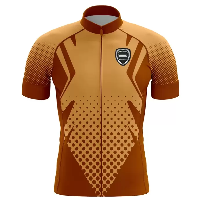 Colaro Sports, a premium cycling jersey manufacturer, presents its signature orange and brown jersey. Colaro Sports sublimation cycling jersey in exclusive orange-brown halftone gradient, fully customizable, high-quality sublimated cycling jerseys that never fade, crack, or peel. This short-sleeve masterpiece showcases a golden-orange/tan upper body seamlessly transitioning into reddish-brown sides and sleeves through a halftone dot gradient that increases in size and density, creating a 3D effect on shoulders and torso. Colaro Sports' every jersey is crafted with reinforced stitching for unmatched durability.