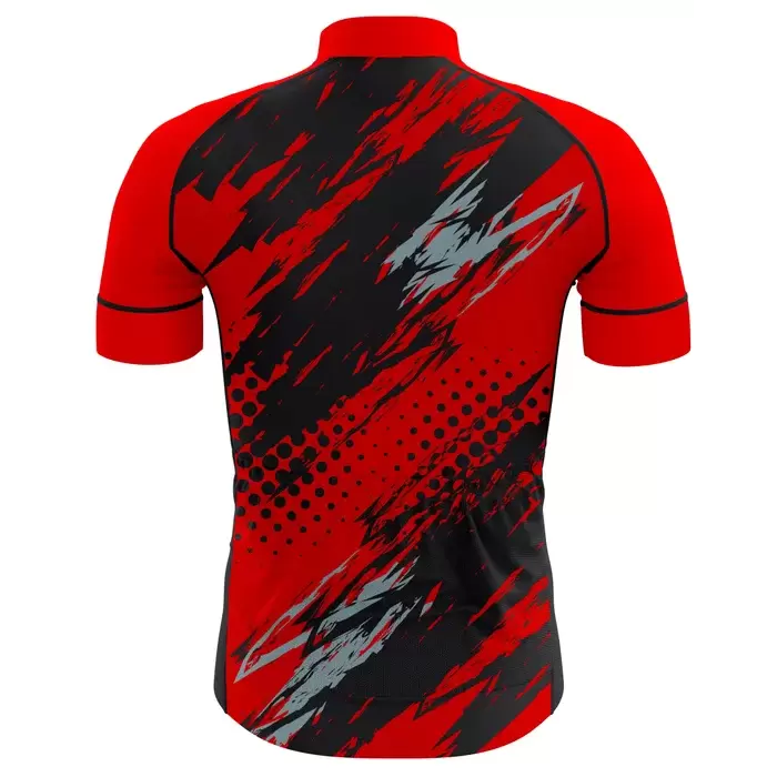 Discover premium cycling jerseys from Colaro Sports, the leading manufacturer of high-performance cycling jerseys designed for champions. Colaro Sports red and black sublimation cycling jersey. Abstract brushstroke patterns, halftone dots, solid red raglan sleeves with black cuffs, and a short zipper collar. Unmatched quality and bold design.