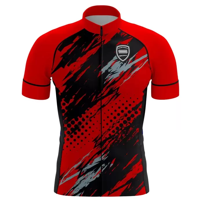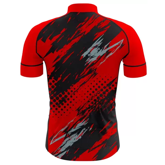 Colaro Sports, a premium cycling jersey manufacturer, presents its signature red and black jerseys. Colaro Sports red and black abstract sublimation cycling jersey designed for riders who refuse to blend in. Dynamic black and gray brushstroke patterns overlay a vibrant red base, enhanced by strategic halftone dot clusters that create explosive visual energy across the chest and torso. Colaro Sports is their exclusive custom cycling jersey manufacturer for unbeatable quality, innovation, and style.