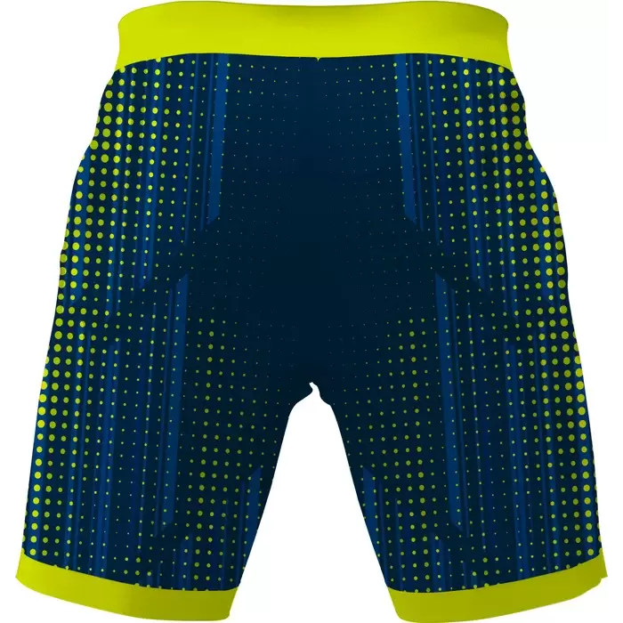Colaro Sports, a premium gym shorts manufacturer, presents its signature yellow-green gym shorts. Colaro Sports' soccer-inspired shorts that combine playful design with serious performance. The rich navy blue base provides the perfect backdrop for bright yellow-green polka dots and coordinating vertical stripes, creating a pattern that's both fun and sophisticated. The vibrant yellow waistband adds a bold accent that ties the entire design together with visual confidence.
