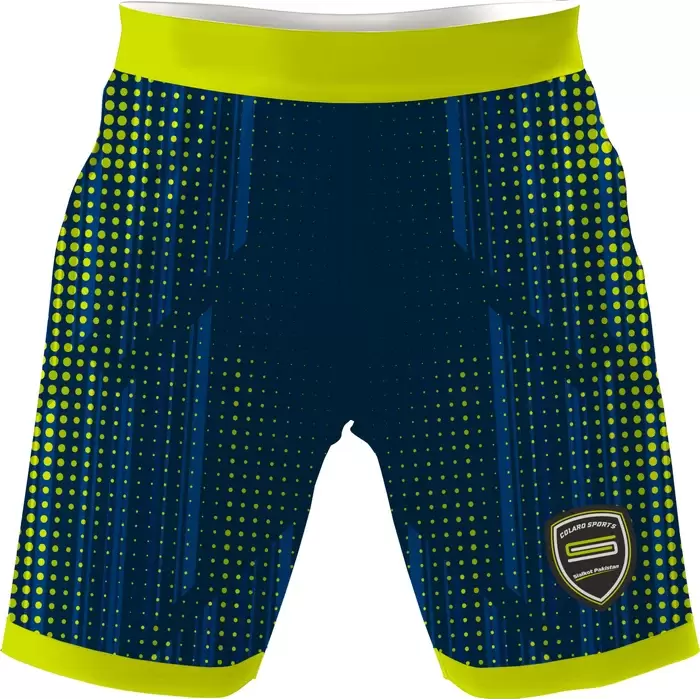 Discover premium Gym Shorts from Colaro Sports, the leading manufacturer of high-performance gym shorts designed for extreme workouts. Colaro Sports presents soccer-inspired athletic shorts with distinctive style. Navy blue fabric features playful yellow-green polka dots and vertical stripes, creating energetic visual appeal. The prominent yellow waistband frames the design perfectly, while the detailed embroidered shield logo adds premium authenticity. Sleek, modern construction makes these shorts ideal for soccer, training, or any athletic activity requiring performance and standout style.