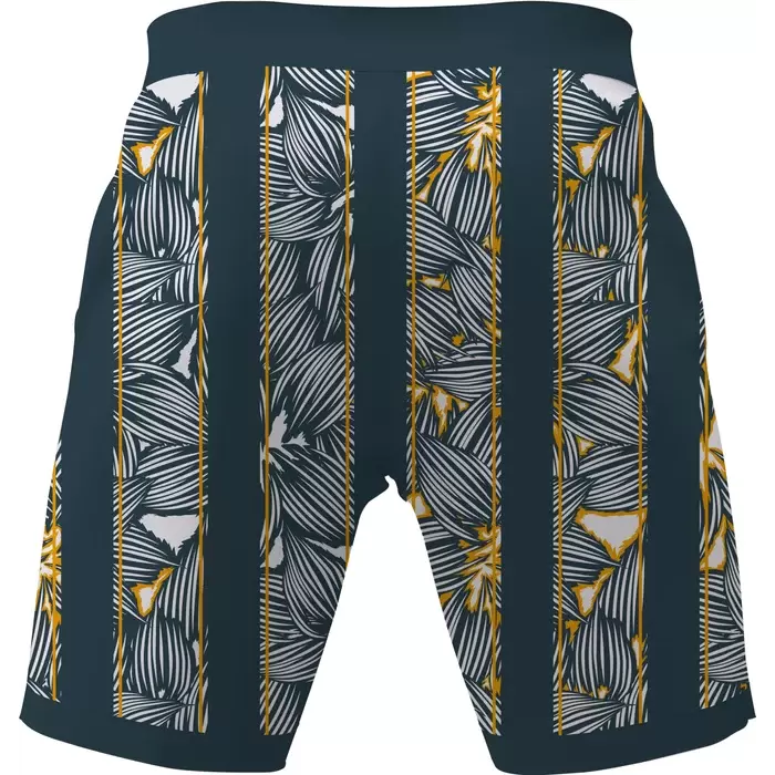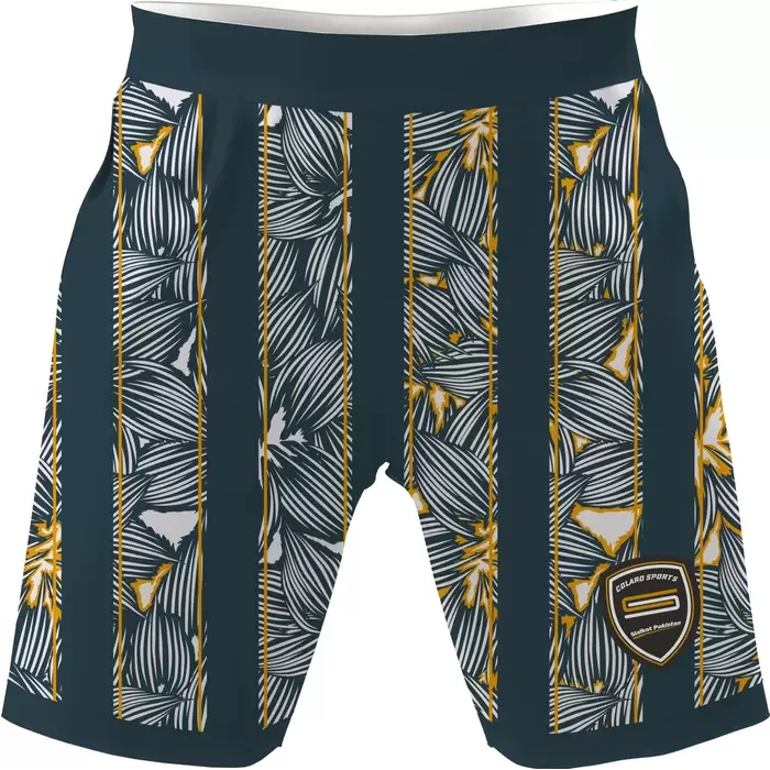 Colaro Sports, a premium gym shorts manufacturer, presents its signature white and gold gym shorts. Colaro Sports' navy blue athletic shorts. These sophisticated shorts feature distinctive vertical stripes showcasing an elegant monochrome floral pattern in white and gold, creating a refined aesthetic that stands apart from typical athletic wear. The thoughtful design elevates these shorts from purely functional gear to versatile lifestyle pieces.