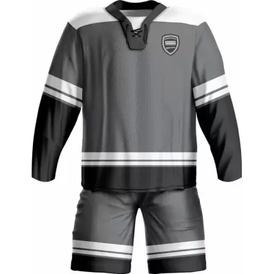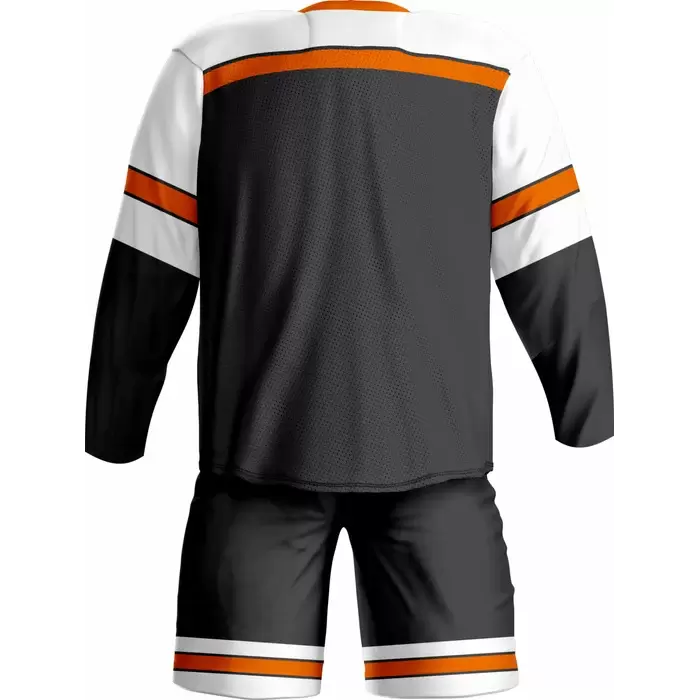 Discover premium ice hockey uniforms from Colaro Sports, the leading manufacturer of high-performance ice hockey uniforms designed for champions. Colaro Sports black ice hockey uniform featuring white sleeves, orange stripes, and a laced V-neck. This premium sublimation custom ice hockey jersey and shorts combo dominates the rink.
