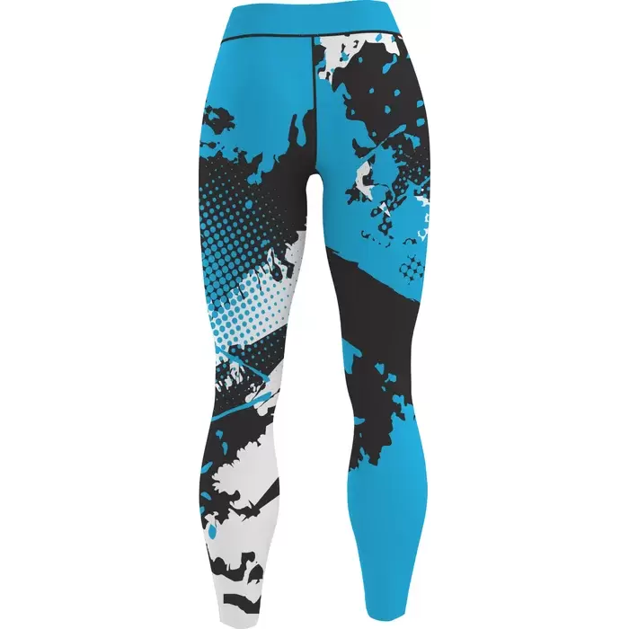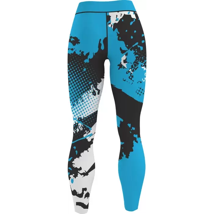 Colaro Sports, a premium leggings manufacturer, presents its signature black and blue tight. Colaro Sport black and blue athletic leggings featuring an electrifying abstract pattern. The dynamic design showcases aggressive brushstroke-like splatters combined with dotted textures, creating an edgy, urban-inspired aesthetic that breaks from traditional athletic wear conventions. Splashes of white and grey add depth and dimension to the predominantly black and blue color scheme, resulting in a modern, street-ready look.