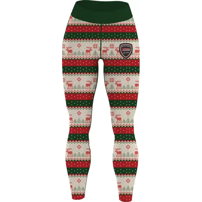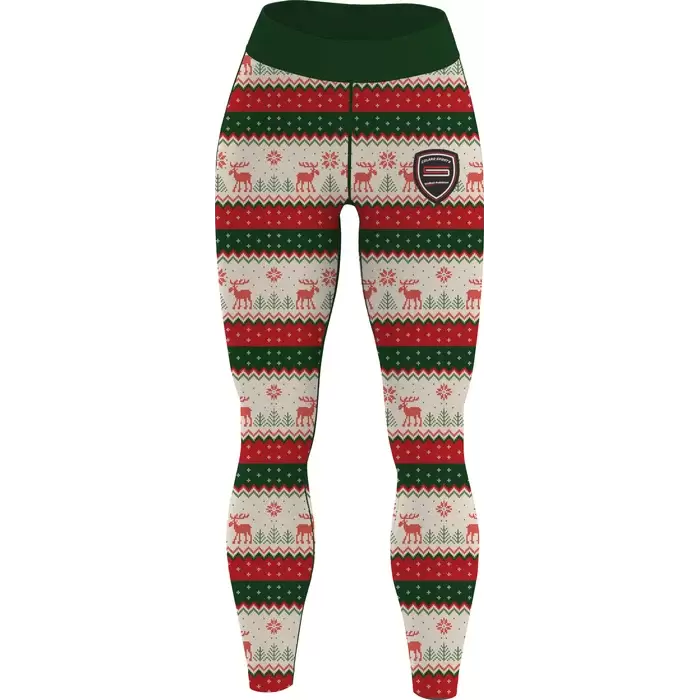 The dark green waistband provides beautiful color coordination while ensuring secure, comfortable support during movement. Crafted from smooth, stretchy spandex-blend fabric, these leggings offer a snug, flattering fit that maintains its shape throughout wear. The circular embroidered Premier League patch on the right thigh adds an authentic sports heritage element, connecting athletic tradition with seasonal celebration. Whether you're training at the gym, running holiday errands, or attending casual winter events, these leggings deliver Colaro Sports' signature quality while expressing your festive spirit with style and comfort that lasts all season long