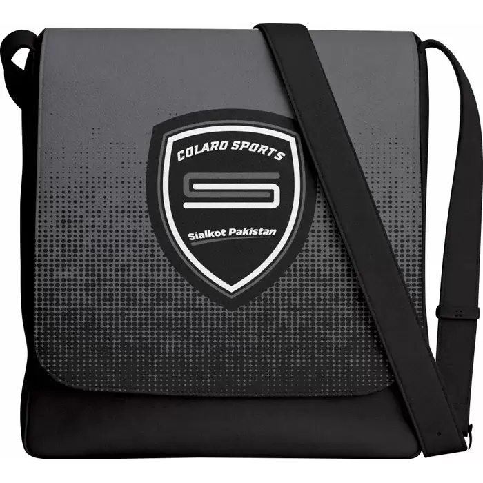 Discover a premium messenger bag from Colaro Sports, the leading manufacturer of high-performance messenger bags crafted specifically for athletes. Colaro Sports gradient messenger bag combines sophistication with athletic style. Featuring a stunning dark gray-to-black transition with dotted texture on top and solid black below, this bag makes a bold statement. The prominent white Colaro Sports emblem takes center stage, while the diagonal black strap with metal buckle adds functional elegance. Smooth, slightly glossy finish completes this premium design.