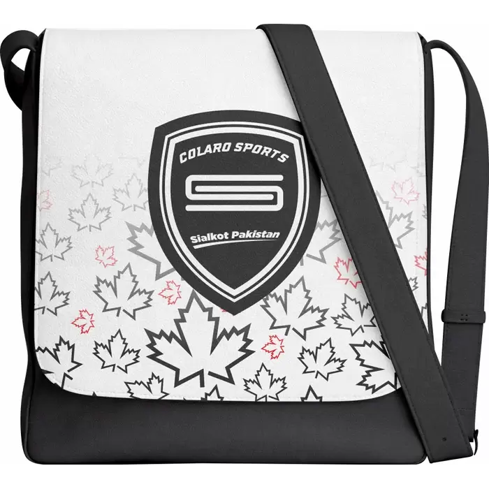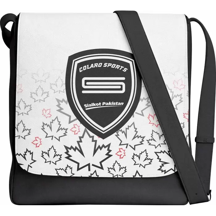 Colaro Sports, a premium bag manufacturer, presents its signature black and white messenger bag. Colaro Sports' canvas messenger bag is a perfect fusion of national identity and athletic style. This distinctive bag showcases the iconic maple leaf motif in bold red and grey tones, immediately recognizable symbols of Canadian heritage. The sophisticated gradient effect transitions seamlessly from deep black to pure white, creating a dynamic backdrop that makes the design elements pop.