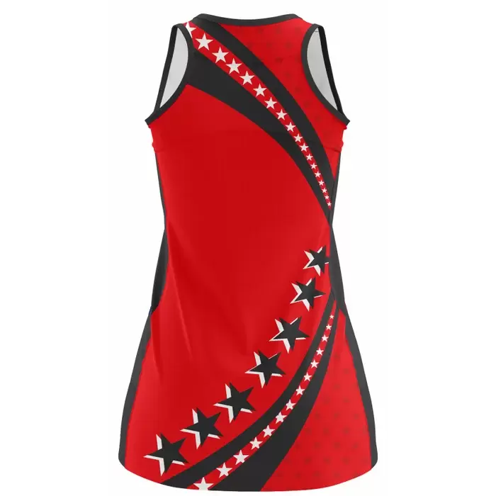 Colaro Sports, a premium netball uniform manufacturer, presents its signature red body netball uniform. Colaro Sports sets the standard with a sublimated netball uniform design. Colaro Sports' red, black, and white dress features a powerful diagonal black stripe exploding with giant black stars outlined in white, complemented by a parallel, thinner stripe lined with mini stars, pure attitude in motion.