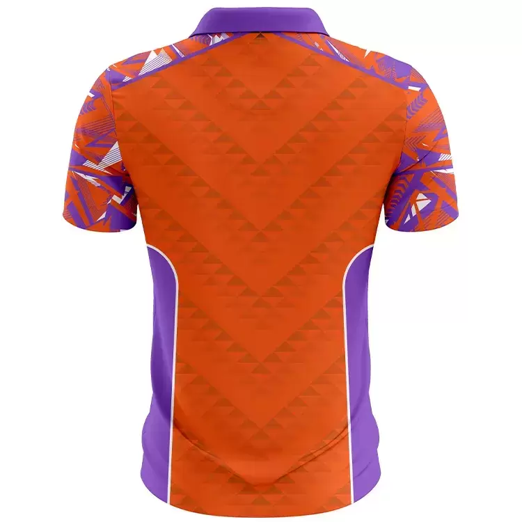 Discover premium Polo T-shirts from Colaro Sports, the leading manufacturer of high-performance Polo T-shirt designed for extreme workouts. Colaro Sports sublimation polo t-shirt in explosive orange chevron patterns and royal purple side trim. Lightweight, stretchable, and fully customizable with chest logo. Perfect custom activewear for running, outing, and training.