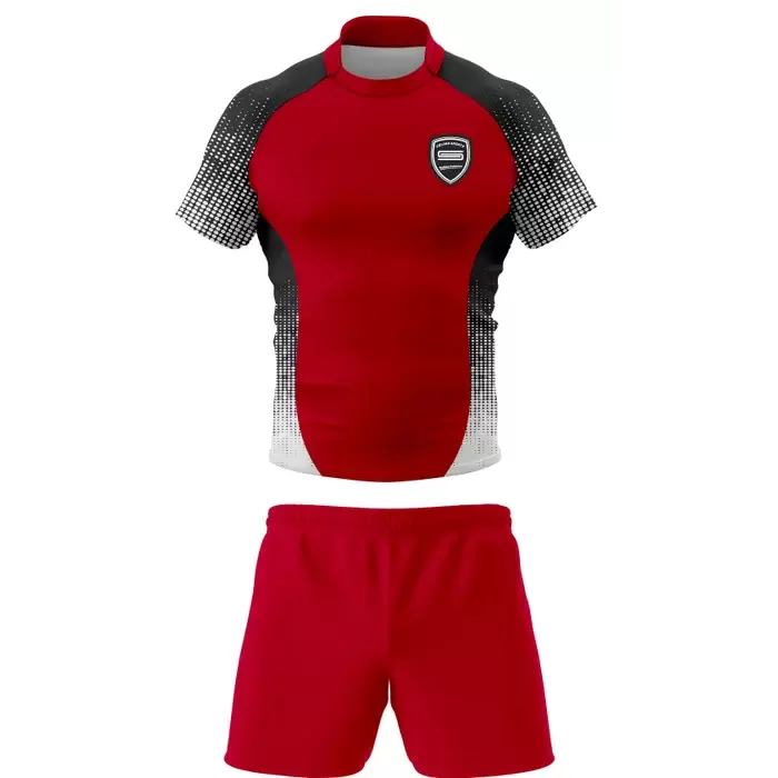Discover premium rugby uniforms from Colaro Sports, the leading manufacturer of high-performance rugby uniforms designed for champions. Colaro Sports red rugby uniform. Fully sublimated short-sleeve jersey featuring black pixelated/fading speckled sleeves and side panels, paired with solid red shorts. Maximum durability, vibrant permanent colors, total customization.