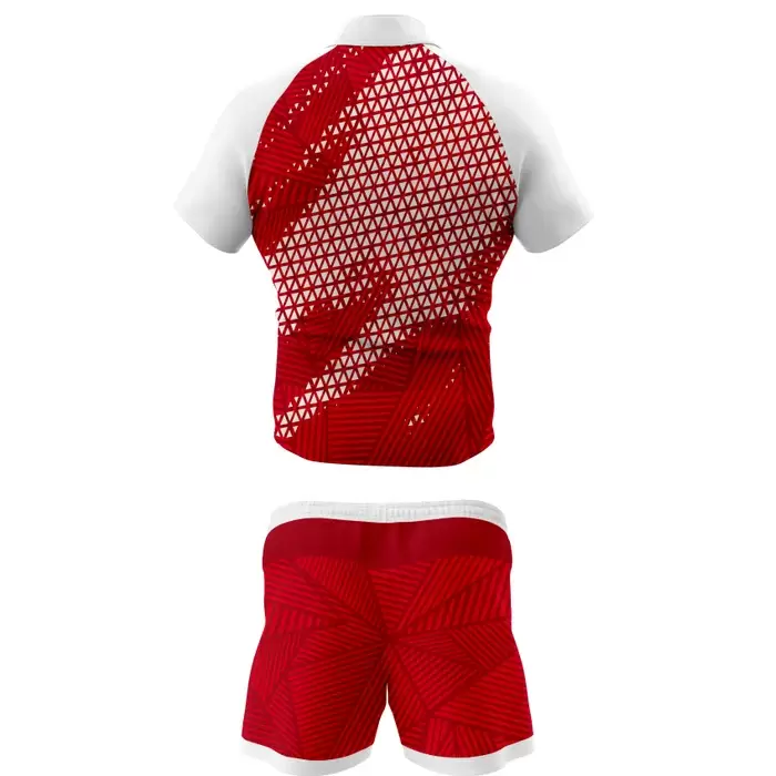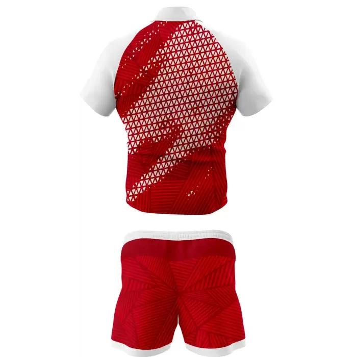 Discover premium rugby uniforms from Colaro Sports, the leading manufacturer of high-performance rugby uniforms designed for champions. Colaro Sports red and white sublimation rugby uniform, a bold short-sleeve rugby jersey with white raglan sleeves, dynamic white triangle geometric pattern fading into vibrant red body, paired with matching red rugby shorts featuring white waistband and subtle textured detailing. Fully customizable, moisture-wicking, and durable.