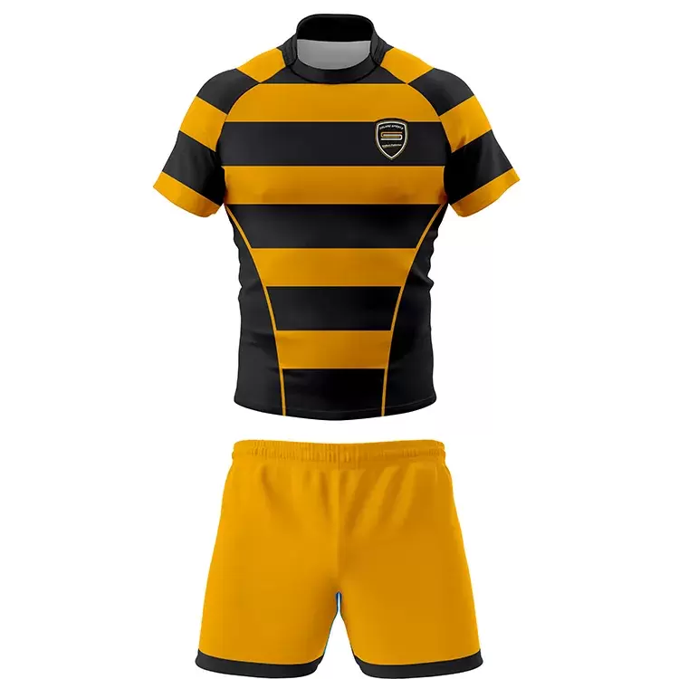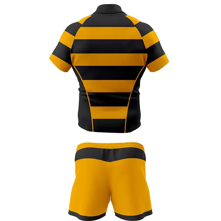 Discover premium rugby uniforms from Colaro Sports, the leading manufacturer of high-performance rugby uniforms designed for champions. Colaro Sports rugby uniforms with bold black and gold horizontal stripes. This custom cut-and-sew rugby kit includes a short-sleeve jersey with gold shoulder panels, black side accents, rounded collar, and matching solid gold shorts with black trim. Perfect for teams wanting standout style and elite performance on the field.
