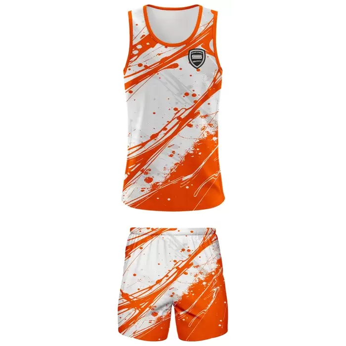 Discover premium running suits from Colaro Sports, the leading manufacturer of high-performance running suits designed for extreme game. Colaro Sports orange paint splatter sublimation running suit. Wild orange and white splatter design with circular chest logo. Lightweight tank top + shorts set. The most energetic custom running suit, unmatched style, and performance. Perfect men’s/women’s running suit for track, gym, or marathon training.