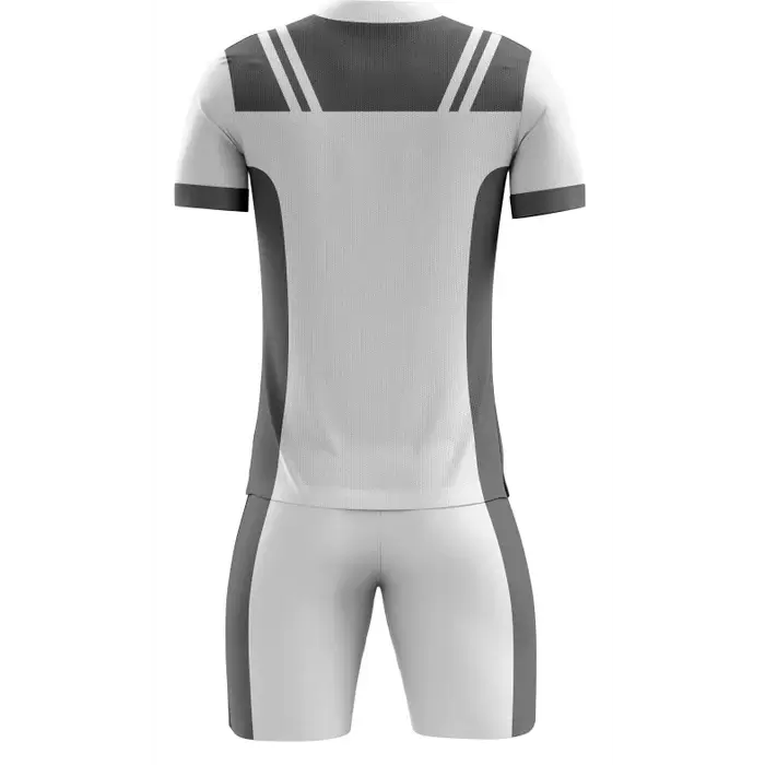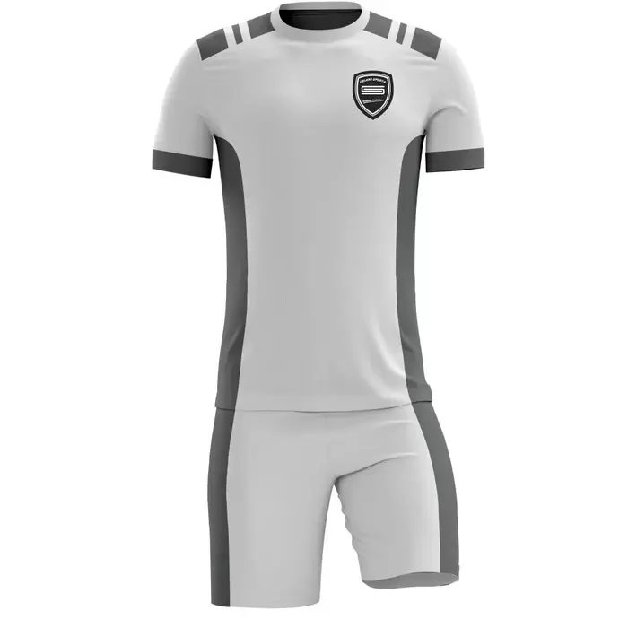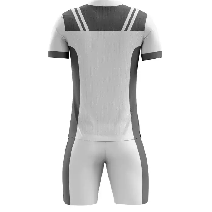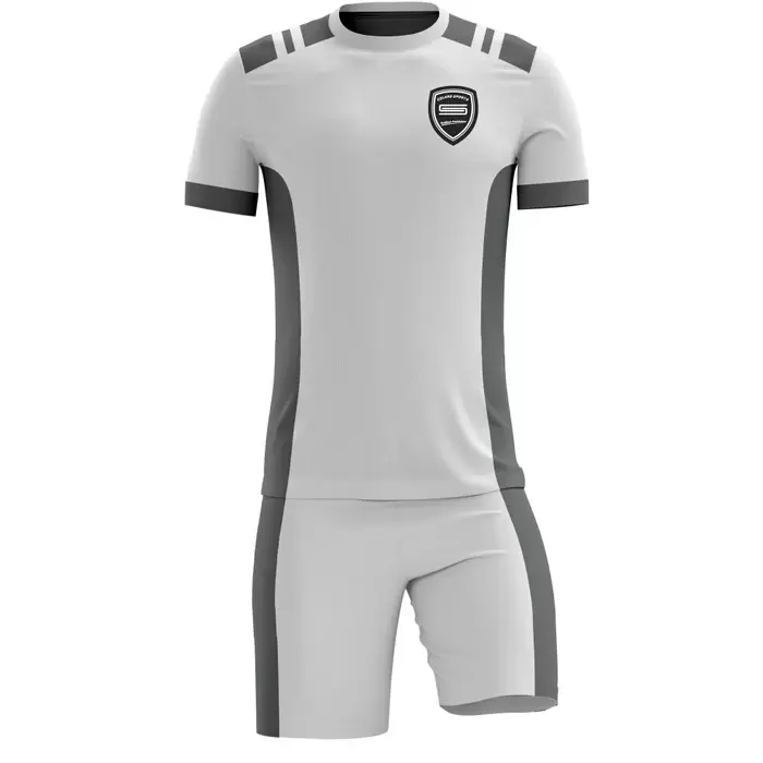 Colaro Sports, a premium soccer uniform manufacturer, presents its signature white and dark gray soccer uniform. Redefine class on the pitch with the bestselling Colaro Sports white and dark gray soccer uniform, which is a masterpiece of modern football uniform design. Our short-sleeve jersey features a brilliant white base elevated by a sophisticated dark gray crew-neck collar, bold striped shoulder accents, and streamlined dark gray side panels that run from underarm to hem. This seamless paneling continues perfectly onto the matching shorts, creating an elongated, professional silhouette that looks incredible in motion and photographs. Clean, sharp, and undeniably premium, this is the go-to custom soccer kit for ambitious clubs and academies worldwide.