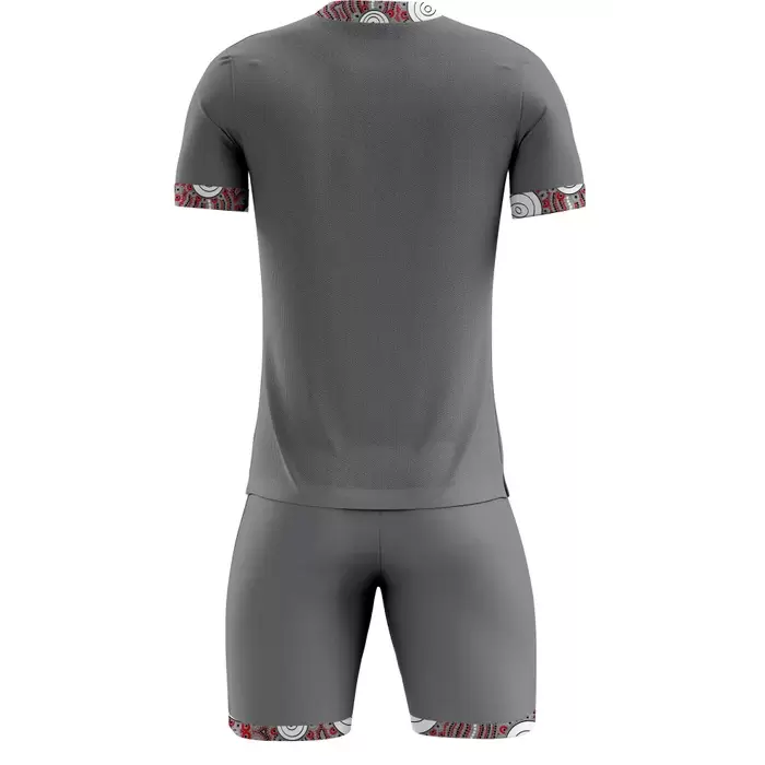 Colaro Sports, a premium soccer uniform manufacturer, presents its signature dark gray soccer uniform. Colaro Sports sublimated soccer uniform in sophisticated dark gray with fierce red, black, and white accents. The left-chest logo and repeating geometric patterns on collar, cuffs, and shorts hems are fully embedded via dye-sublimation for a kit that looks pro and lasts seasons.