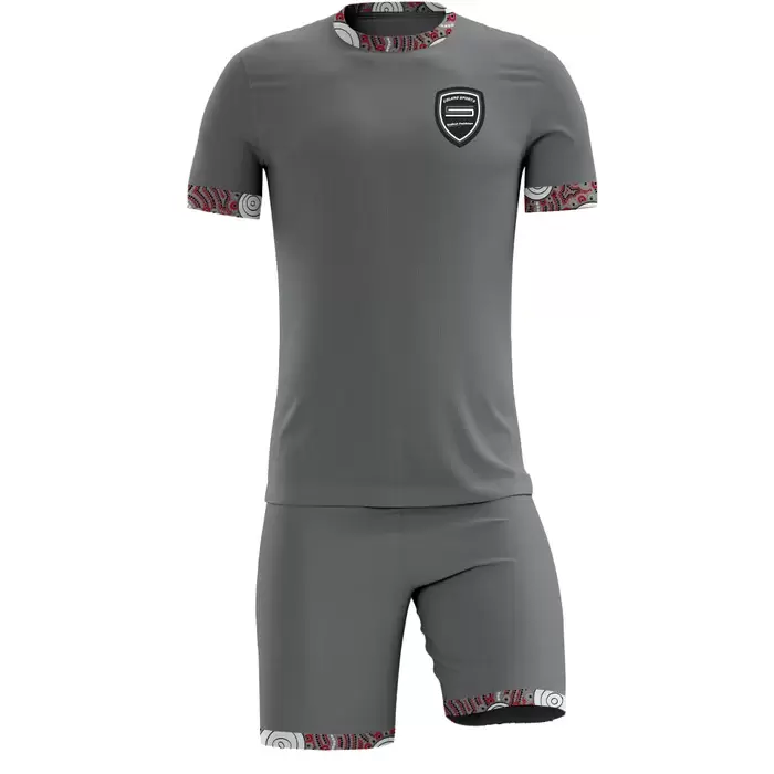 Discover premium soccer uniforms from Colaro Sports, the leading manufacturer of high-performance soccer uniforms designed for champions. Colaro Sports dark gray sublimation soccer uniform featuring a bold red-black-white shield crest and matching abstract collar/cuff patterns. Short-sleeve jersey and shorts set with permanent dye-sublimation printing.