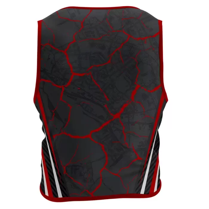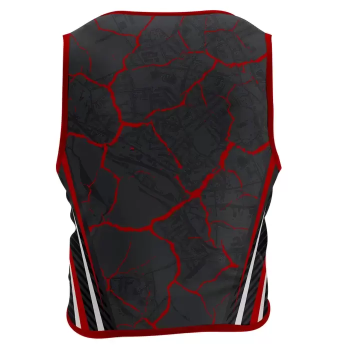 Colaro Sports, a premium sports bib manufacturer, presents its signature cracked rock pattern jersey. Colaro Sports crafts a dynamic black sports vest using premium sublimation techniques to achieve a striking cracked rock pattern in vivid red across the fabric. This unique texture gives the vest an aggressive, powerful look while maintaining a lightweight feel. The left chest features a professionally embroidered white and red logo, providing a premium touch that highlights team or organizational pride. A bold white and red stripe runs along the bottom edge, adding sharp contrast and a sense of speed to the overall design.