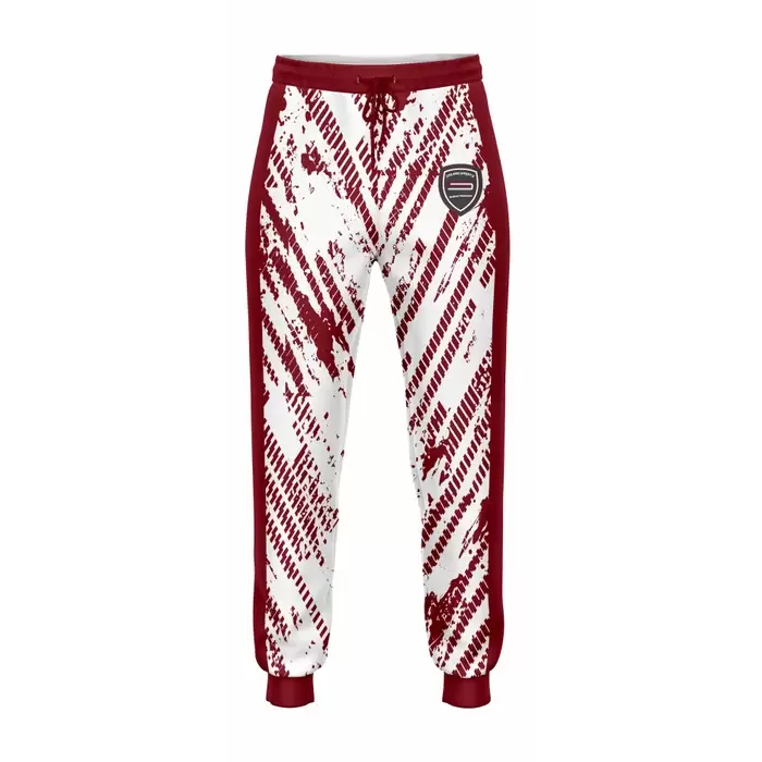 Discover premium Sweatpants from Colaro Sports, the leading manufacturer of high-performance Sweatpants designed for extreme workouts. Colaro Sports presents sweatpants designed for modern athletes who value comfort and flair. Featuring a white base with bold burgundy stripes and a dynamic splattered effect, these joggers combine smooth, breathable fabric with a relaxed fit. A shield logo adds subtle branding, while the energetic design ensures standout style for training, casual wear, or team-inspired collections.