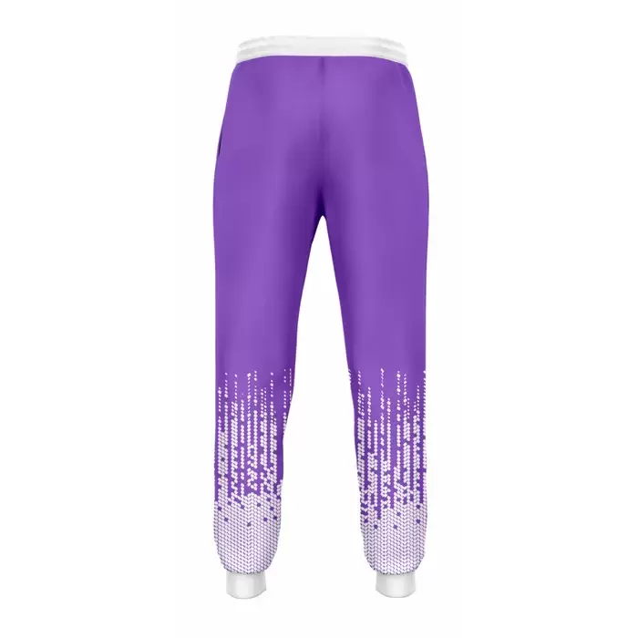 Colaro Sports, a premium sweatpants manufacturer, presents its signature white and blue sweatpant. Colaro Sport presents sweatpants that embody a modern, sporty aesthetic with a vibrant twist. The design centers on a bold purple base, accented by a striking gradient of small white squares that fade toward the ankles. White details on the waistband and drawstring provide clean contrast, enhancing the overall contemporary look. These joggers are crafted from smooth synthetic fabric, ensuring comfort and durability for both athletic and casual use.