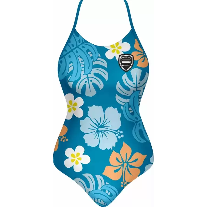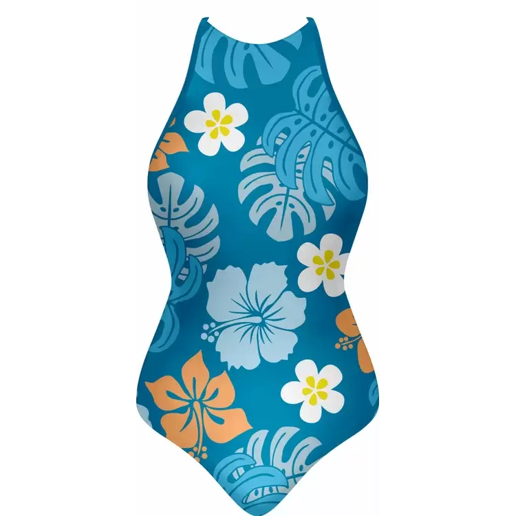 Discover premium Swimsuits from Colaro Sports, the leading manufacturer of high-performance Swimsuits designed for champions. Colaro Sports presents this vibrant sublimated one-piece swimsuit, featuring a tropical floral pattern on premium polyester blend fabric. Bold blue base with large white and orange hibiscus flowers, accented by yellow centers, creates a summery appeal. Designed with a high neckline, thin straps, front zipper, and a signature circular logo for style and functionality.