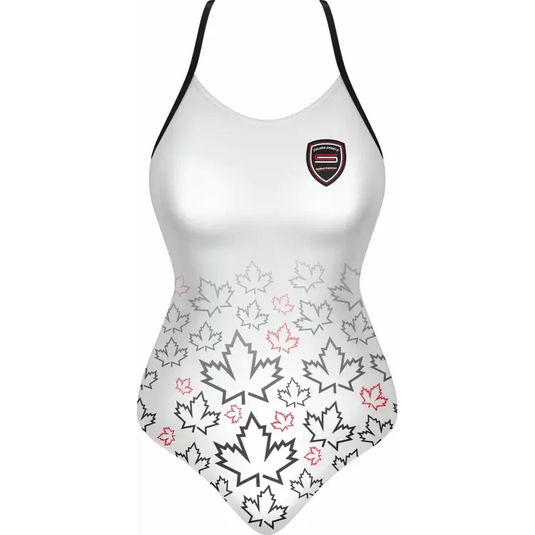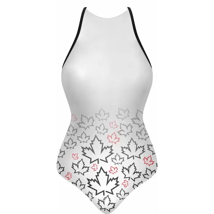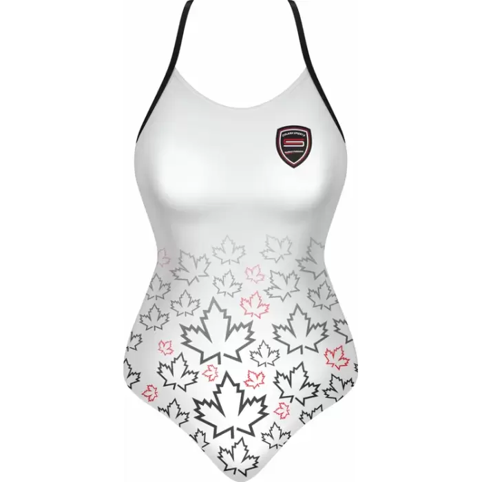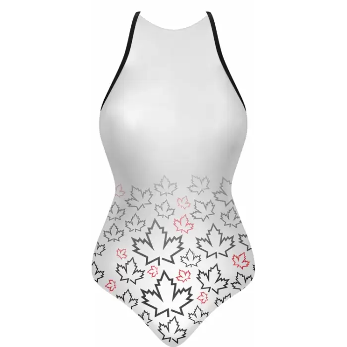 Discover premium Swimsuits from Colaro Sports, the leading manufacturer of high-performance Swimsuits designed for champions. Colaro Sports elegant sublimated sleeveless one-piece swimsuit in crisp white. The top half remains plain, transitioning to a bottom gradient of black and pink maple leaves on premium fabric. Thin black straps and a black-and-red chest logo complete the sophisticated, nature-inspired design perfect for stylish swimmers.