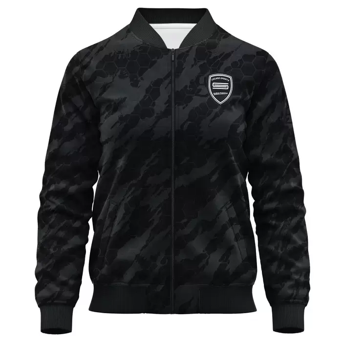 Discover a premium Jacket from Colaro Sports, the leading manufacturer of high-performance Jacket designed for champions. Colaro Sports introduces the Training Jacket, a bold sublimation bomber jacket featuring a striking black camo pattern with dark hexagonal shapes over a lighter black base. A white interior lining, white embroidered Colaro Sports logo, and ribbed collar, cuffs, and hem complete the sporty, modern silhouette crafted from a smooth polyester-spandex blend for comfort and flexibility.
