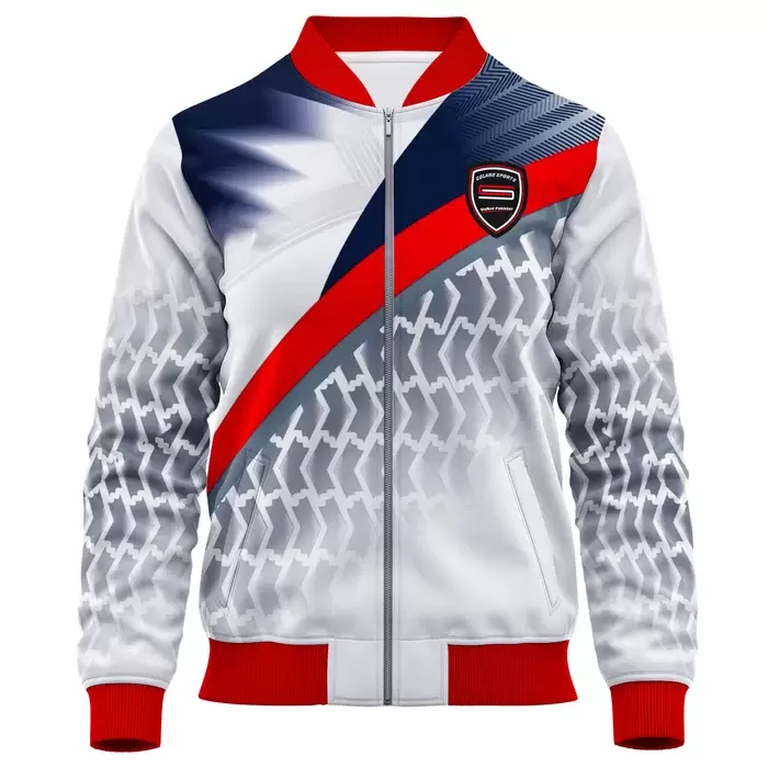 Colaro Sports, a premium Jacket manufacturer, presents its signature blue, white, gray, and red. Colaro Sports is a visually complex and artistically sophisticated sublimation bomber jacket that showcases the full potential of modern sportswear design. The predominantly white base provides a crisp, clean canvas for the intricate gray and red geometric patterns that adorn the sleeves and shoulders, creating a structured yet dynamic visual composition. The striking blue and white gradient on the left side adds depth and dimension, while the bold red diagonal stripe on the right introduces an asymmetric energy that keeps the design engaging from every angle.