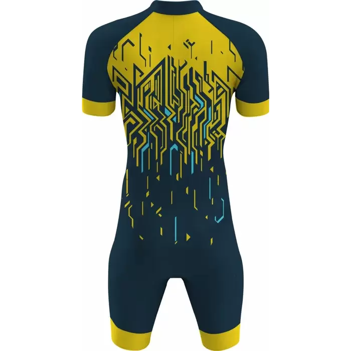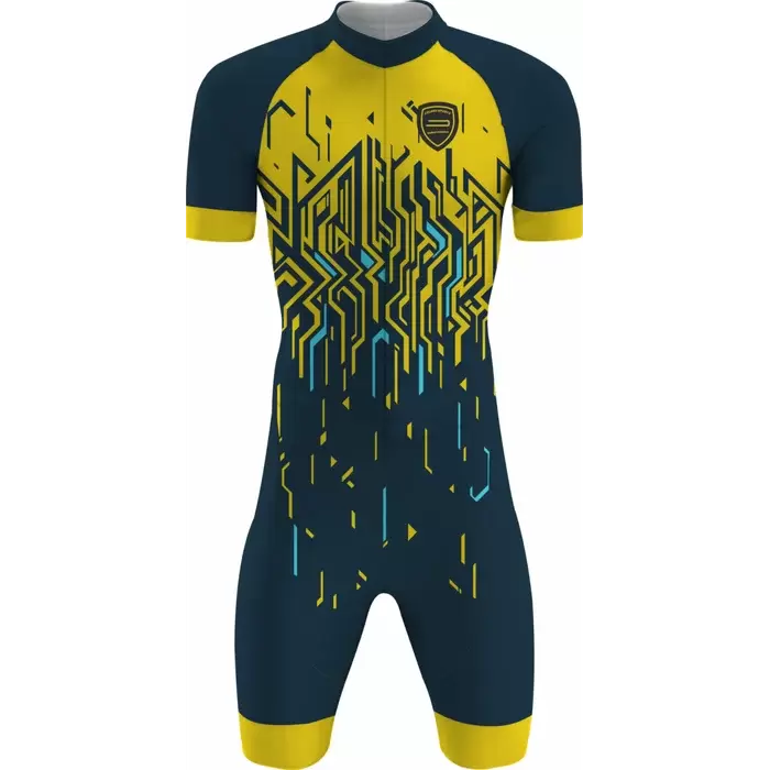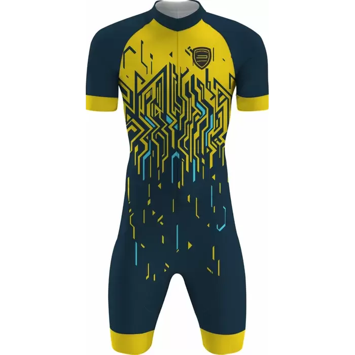 Discover premium Triathlon Uniforms from Colaro Sports, the leading manufacturer of high-performance triathlon uniforms designed for champions. Colaro Sports offers a sleek triathlon outfit in navy blue with bright yellow accents. Featuring a gradient transition and intricate circuit-inspired patterns, the bodysuit and shorts deliver a cohesive, modern look. Made from high-performance Lycra, this outfit ensures breathability, flexibility, and durability, supporting cyclists with comfort and style in competitive environments.
