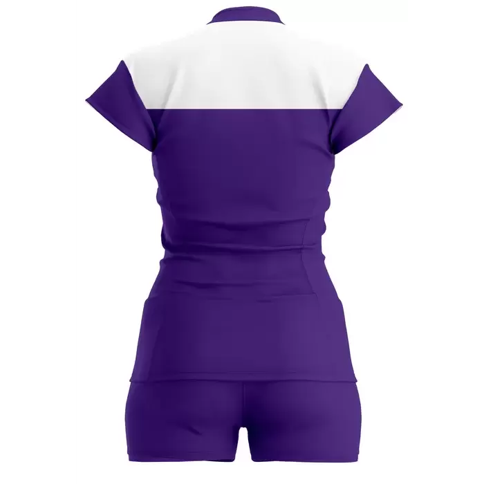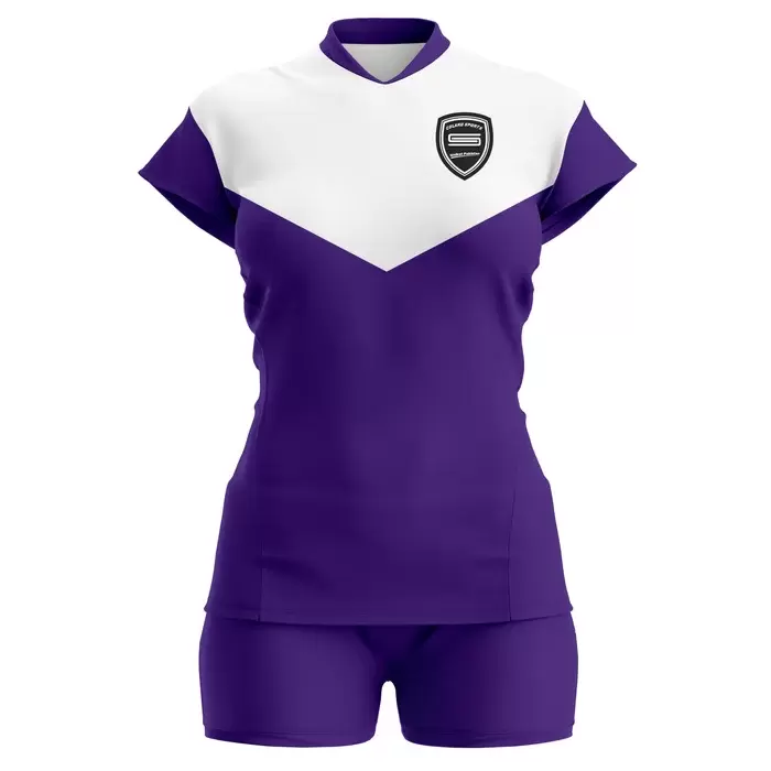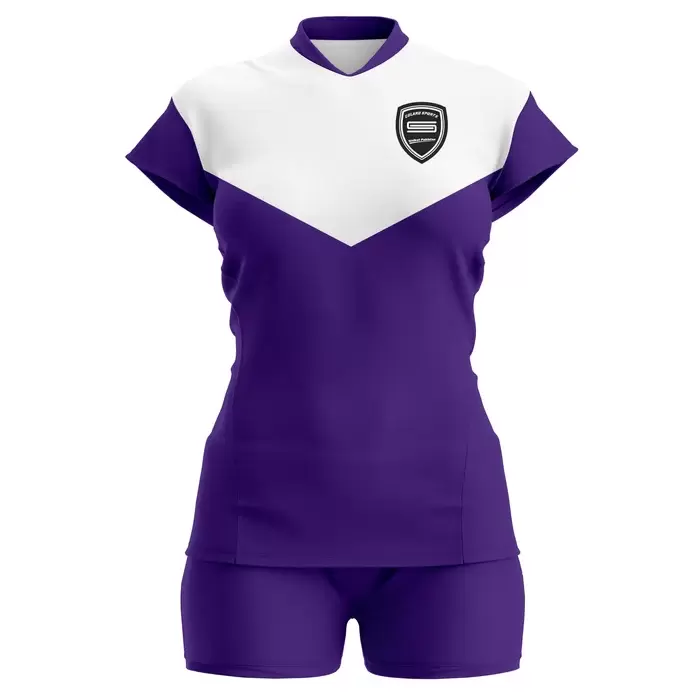 Discover premium sports uniforms from Colaro Sports, the leading manufacturer of high-performance volleyball uniforms designed for champions. Colaro Sports presents a classic white and navy blue cut-and-sew uniform. The short-sleeved jersey features a striking V-shaped navy design on the front and a matching emblem on the chest. Paired with navy shorts, this polyester-spandex blend offers a snug, comfortable fit ideal for high-performance sports.