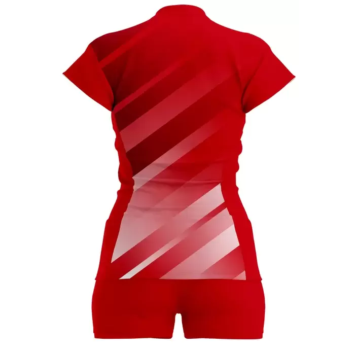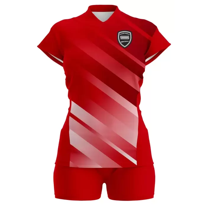 Colaro Sports, a premium volleyball uniform manufacturer, presents its signature red uniform. Colaro Sports brings passion to the pitch with this striking red uniform, featuring a captivating gradient pattern of overlapping red and white diagonal stripes. The short-sleeved jersey incorporates a classic V-neckline for comfort and breathability, while an embroidered shield crest on the left chest adds a touch of heritage and professionalism. The matching shorts complete the kit, ensuring a cohesive look that stands out under stadium lights.